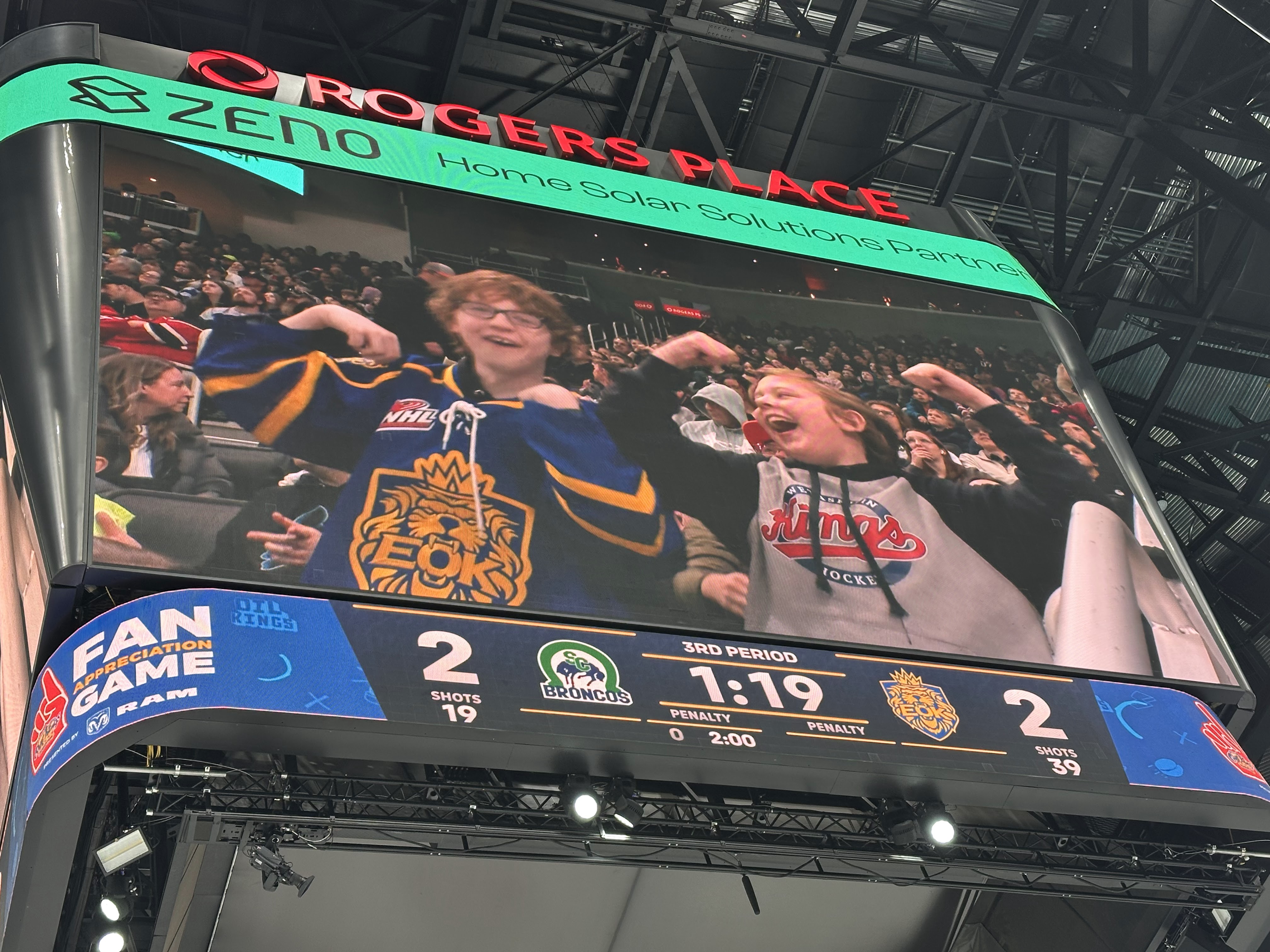And the Oil Kings won. We were rewarded with a game that went into overtime, then had a shoot out. Final score was 3-2! And at Fitz’s request I took a picture of the jumbotron!