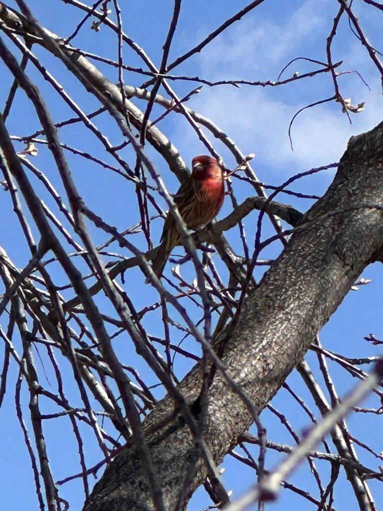 I’m really looking forward to the Brandywine red tomatoes – they have the very large leaves in the picture. Wendy caught this beautiful house finch up in the tree. He had quite a bit of red! And he has a beautiful song. We thought a first it was a female cardinal, but my Merlin App gave me the identity. Have you got your Merlin App?