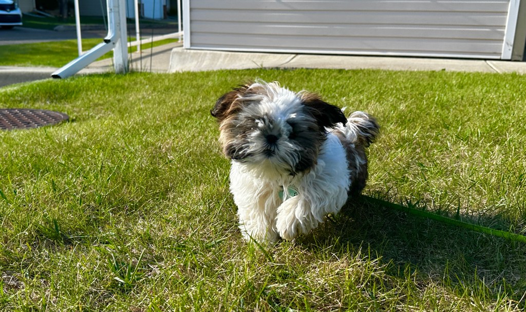 The training of a puppy is a step-by-step process. Walking with us, coming when called, walking with the leash, and walking on the leash have all been pretty much completed successfully. We are now working on “sit,” and next will be “stay.”