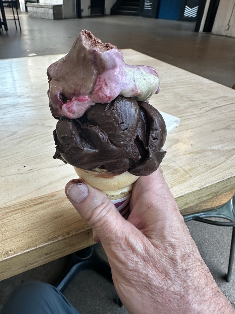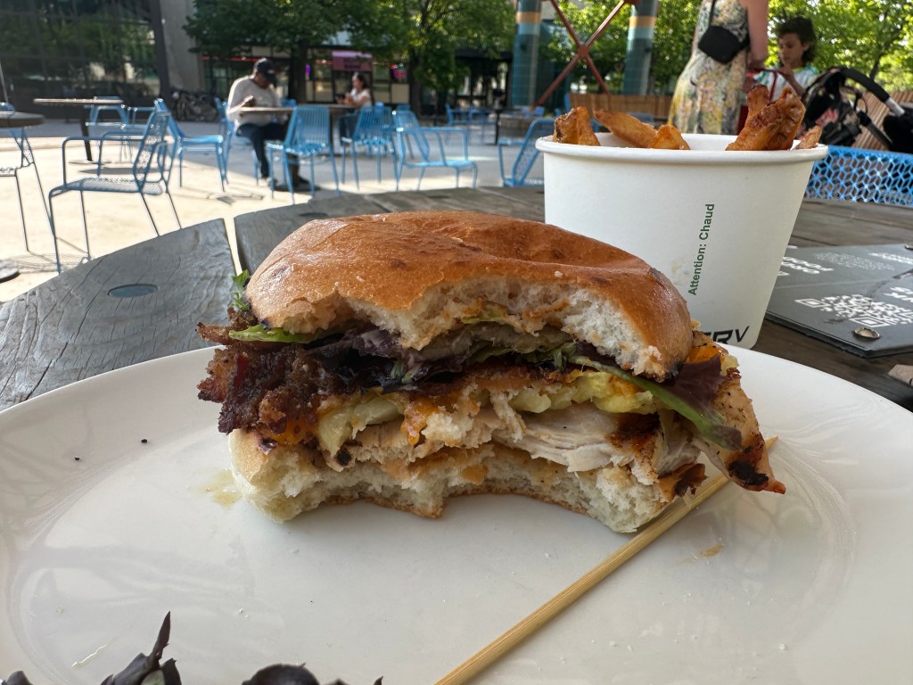 Unlike our tirp to Calgary, this trip is a solo trip for me, and is work related. It’s a great city in good and warm weather. As my hotel was within walking distance of The Forks I was able to walk there last evening to have a good supper, a grilled chicken sandwich with 2 cheeses, grilled pineapple, and dressings on it. The fresh-cut fries were really fresh-cut – delicious!