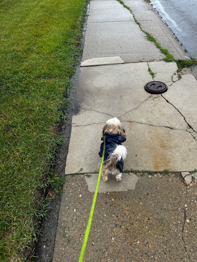 Since it was raining hard we put his raincoat on him for our walk. He reacted like he used to when we started with a leash by sitting down every 10 feet, but before our walk was over he was running in it! But he must have been tired for when we came home while playing with his favourite little blanket, he fell asleep with his head under it.