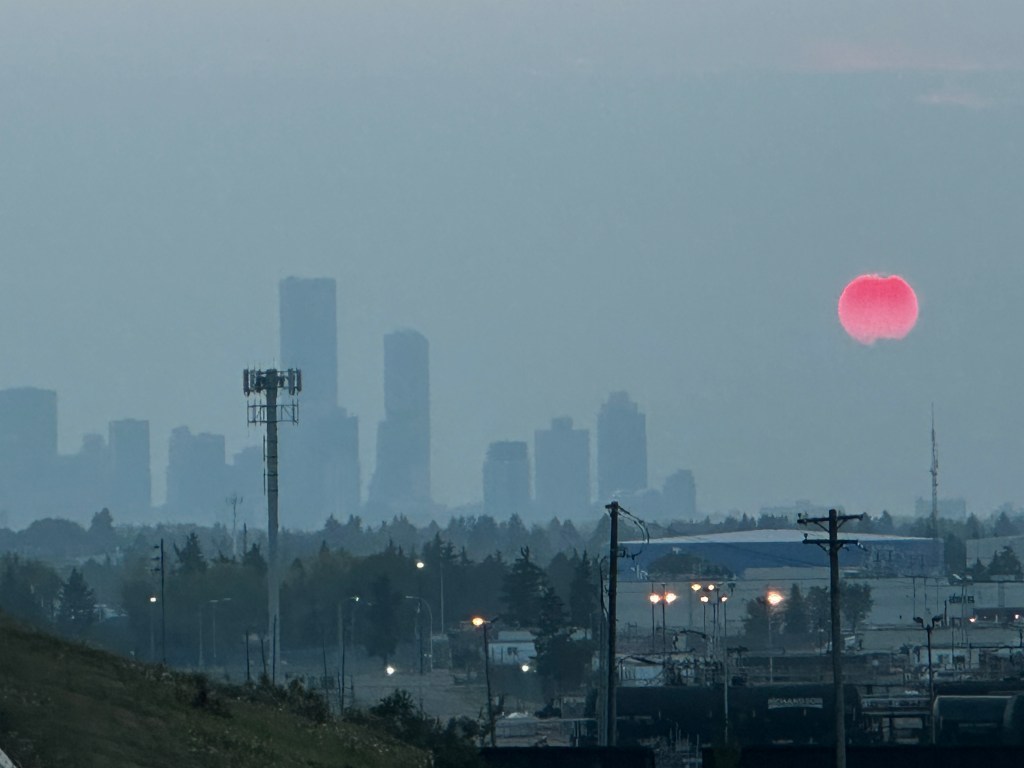 Last evening as I drove east and then west on the same road, the sun was setting. It seemed dramatic, especially on my westbound trip heading home. The sun was coloured by the smoke in the air ,and the haze gave a ghostly outline to the downtown office towers.