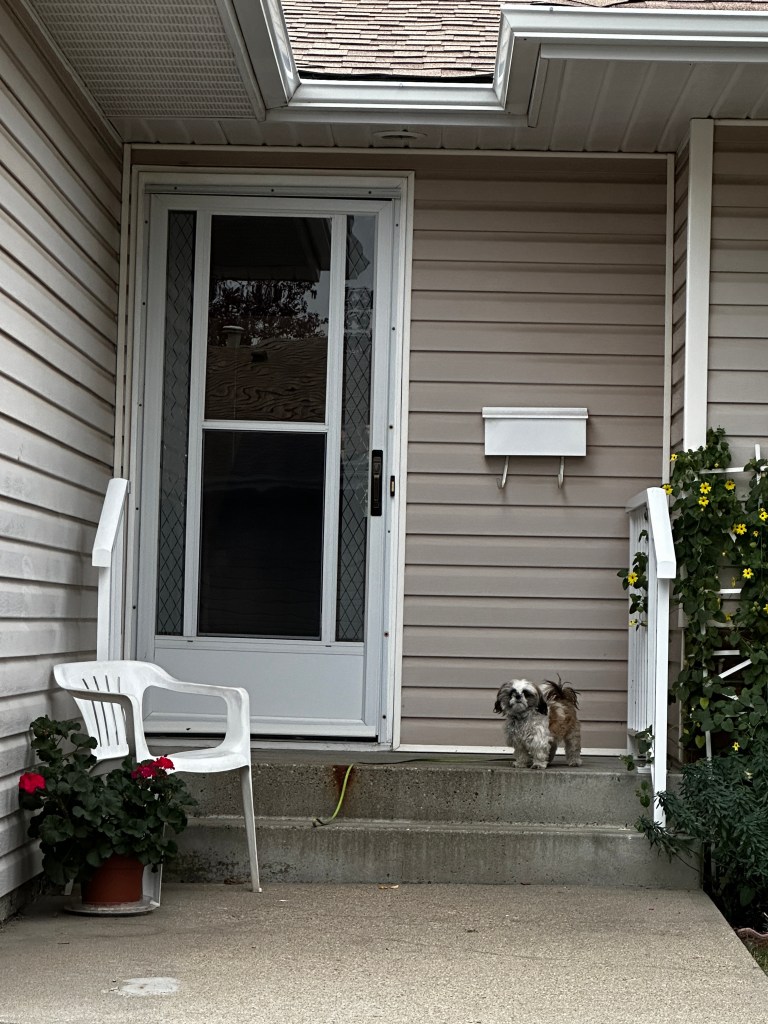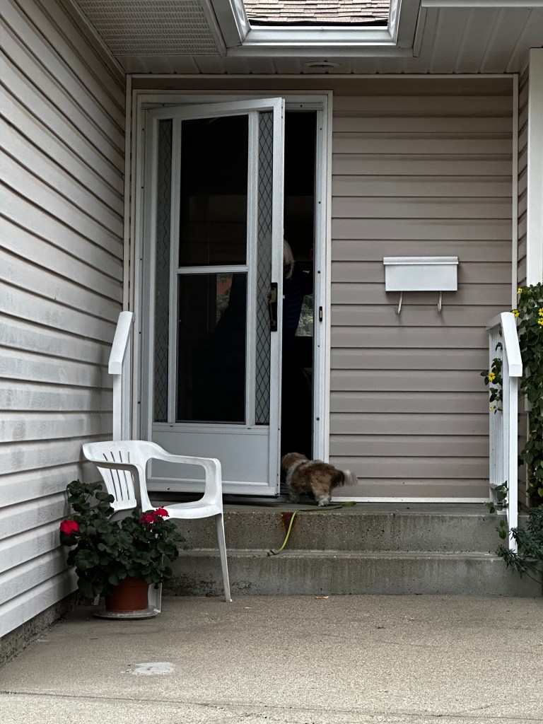 We have a neighbour who through the good weather sits outside her front door on her white chair. She has a bowl of water for the dogs in the neighbourhood. The other day, as the pictures above show Nugget wouldn’t walk past her place even though she wasn’t outside. He could see the main door was open and he could see into the house. I let go of the leash and he ran up to the door and looked in the glass. The next thing I knew Dianne opened the door and he ran in.