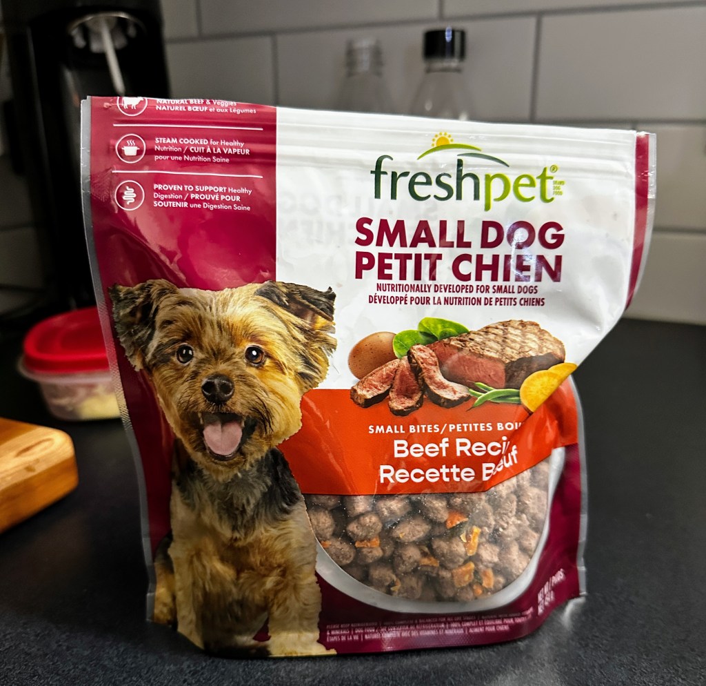 And on an entirely different note, Nugget got some new food this week. That’s right….and it smells delicious. We’re trying a “fresh food” which needs to be refrigerated. The costs are comparable.