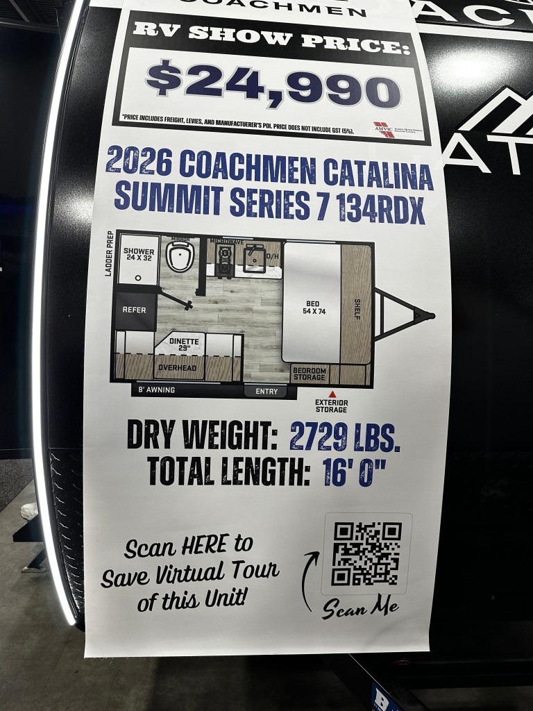 Saturday, I went to the RV show with Rob – now becoming a tradition of sorts. One of the trailers I looked at 2 years ago and LOVED…but it was $39K (ouch – that’s expensive) was again on display. The 2026 model now selling for $65K.