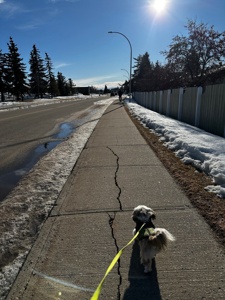 And finally – Nugget and I were out for a walk on Sunday afternoon. The weather has been remarkably mild with about 2/3 of our snow now gone and still about freezing. Going for walks is comfortable, though a bit wet and mucky for Nugget.